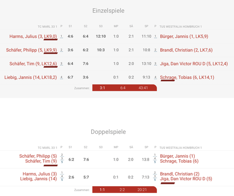 Endlich wieder 3 Herrenmannschaften beim TC Marl 33. Die Herren 3 holten am Wochenende den ersten Saisonsieg im zweiten Spiel und konnten nach den Einzeln mit einer 3:1 Führung in die Doppel starten. Julius Liebig, Emmanuel Magnus-George und Lucas Fahle gewannen die Einzel gegen Gegner mit einer höheren LK und sammelten ordentlich Punkte. Alle zeigten Nervenstärke und holten die wichtigen Punkte denkbar knapp jeweils im Matchtiebreak. Im Doppel holten Julius Liebig und Emmanel Magnus-George den entscheidenden Punkt zum Gesamtsieg. Glückwunsch zur gelungenen Teamleistung!