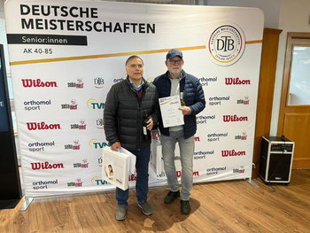 Als Deutsche Meister im Doppel (Herren 70) kehrten Christian Zils und Karlheinz Hähnchen (siehe Foto links) zurück. Den Titel hatten sie sich mit großer Moral erkämpft, nachdem sie in einem Match auf Augenhöhe das an eins gesetzte Doppel Joachim Zoeller/Paul Schulte im Halbfinale mit 7:6/5:7/12:10 des Feldes verwiesen. Im Finale sollten sie gegen das an zwei gesetzte Doppel Xavier de Villepin/Bogdan Jetczak antreten, doch die verzichteten auf den Vergleich auf dem Court.