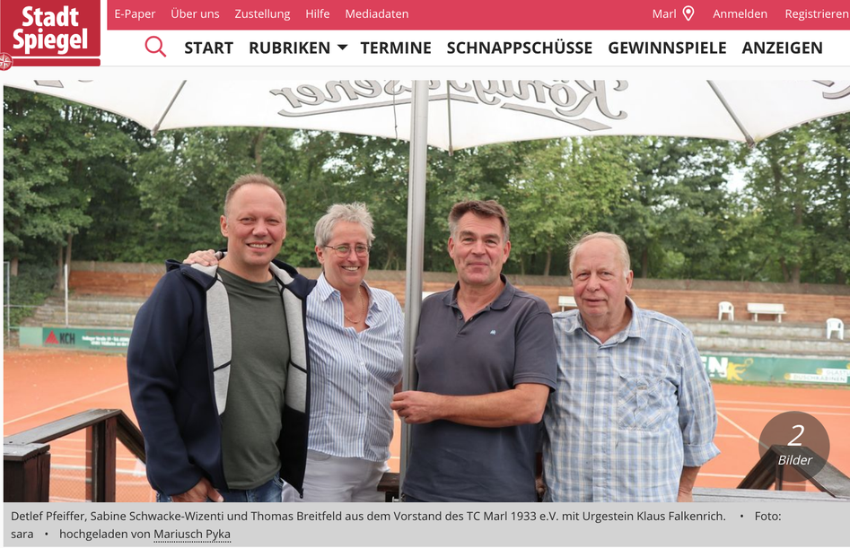 Nun ging es in die zweite, wo der Spitzenspieler und naturalisierte Australier, Colin Davis, Christian Zils keine Chance ließ. Ebenso erging es Uwe Berts (5), Adnan Hoesintalib aus den Niederlanden spielte beim 6:2 und 6:4 zu stark. Auf das Marler Urgestein, Dr. Bertlich, wiederum war Verlass: zweimal 6:1 gegen Wilhelm Guthschmidt (NL). Das nicht erwartete 4:2 nach den Einzeln ließ den Kopf von Mannschaftsführer Dr. Westerdorf rauchen. Wie gewohnt hatte er die gegnerischen Doppelaufstellungen der Vergangenheit umfänglich recherchiert und sich selbst als taktisches Opfer ins erste Doppel gestellt, wo es trotz interessanter Ballwechsel eine Niederlage setzte. Die fehlenden Punkte zum 6:3 Gesamterfolg erspielten dann die beiden anderen Paare: Rolf Makowski und Klaus Harms im 2. und Ralf Bertlich mit Uwe Berts (3.) ließen den Gegner keinen Satz, so dass der anschließende Wolkenbruch bei dem gemütlichen Beisammensein im Clubhaus abgewartet werden konnte. Am kommenden Samstag, 14. Mai, wird beim ersten Heimspiel die Mannschaft von Gladbeck auf der Anlage am Volkspark, Ophoffstr. 60, antreten. Zuschauer sind willkommen!
